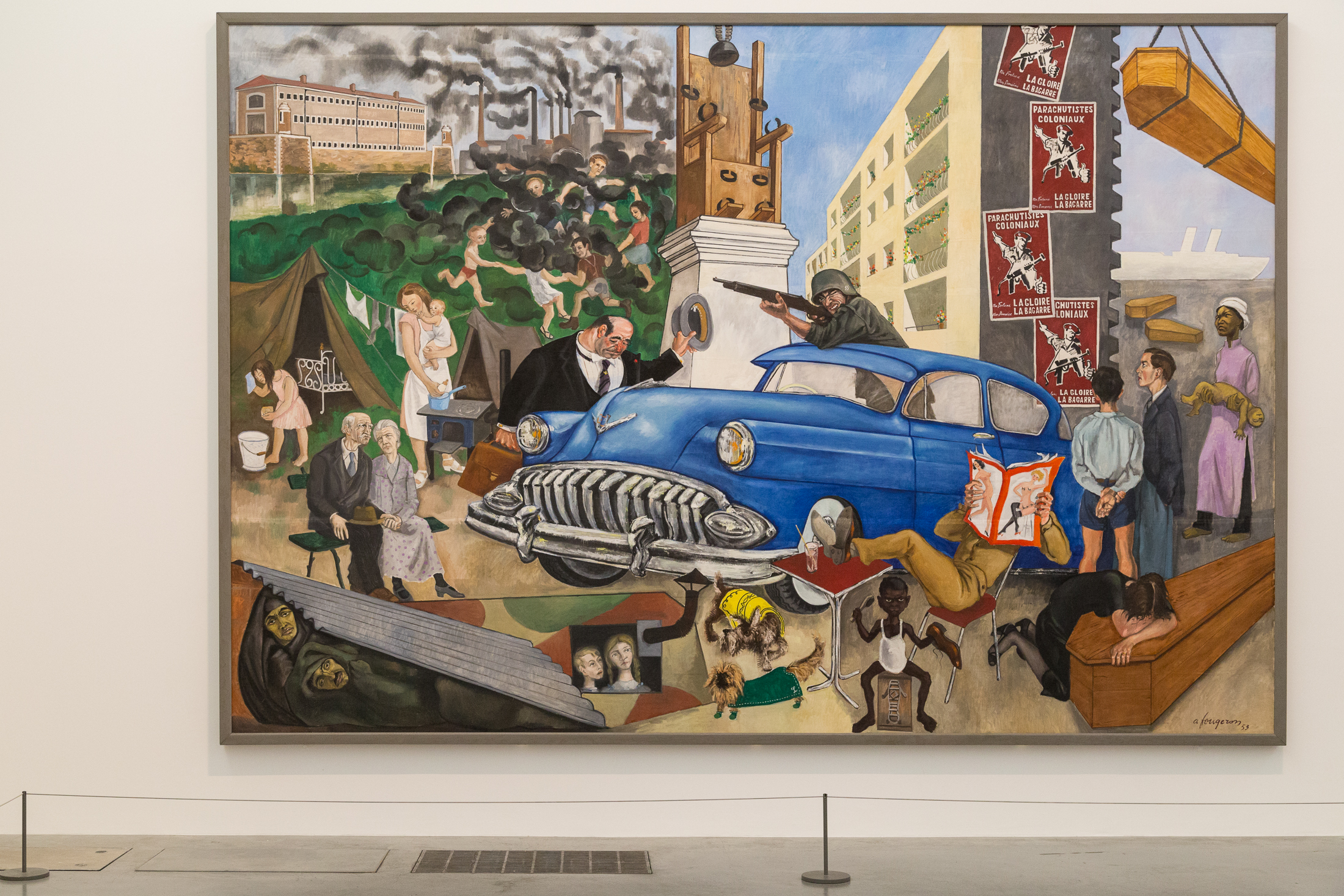 The motif of capitalism played heavily in Fougeron’s Atlantic Civilisation. An artist associated with the French communist party in the 1950s, Fougeron expressed his displeasure with the Americanization of Europe through his works, using caricature especially heavily here to share his view of post-war Europe.