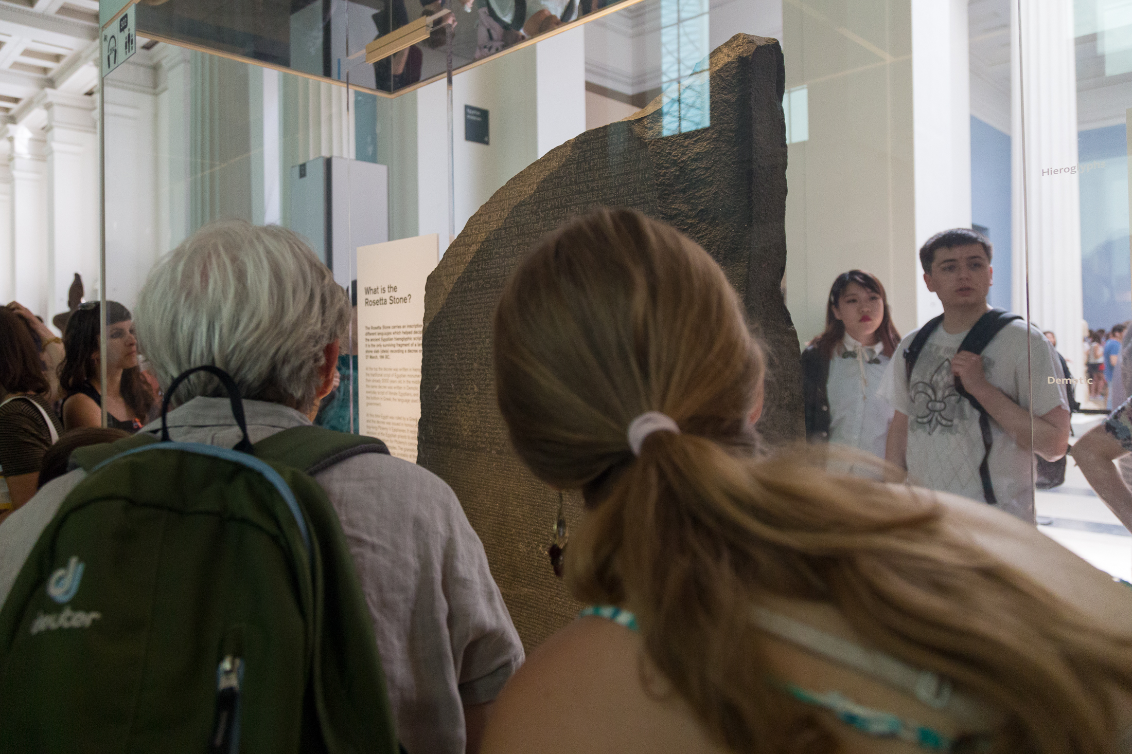 It didn’t take long for things to warm up again, though, and warm they stayed for the rest of the afternoon: my second stop of the day was the British Museum, large and un-airconditioned. There was a long line to get in, mostly due to the security checkpoint, but the crowds inside certainly kept the temperatures up as well, while also blocking most views to the Rosetta Stone. I was fortunate to have my polarizer on me — most times I’m happy to have it for landscape photography, but I had never used it to cut glare inside. It worked like a charm to be able to see through the glass, as the lighting caused reflections from every side of the stone.