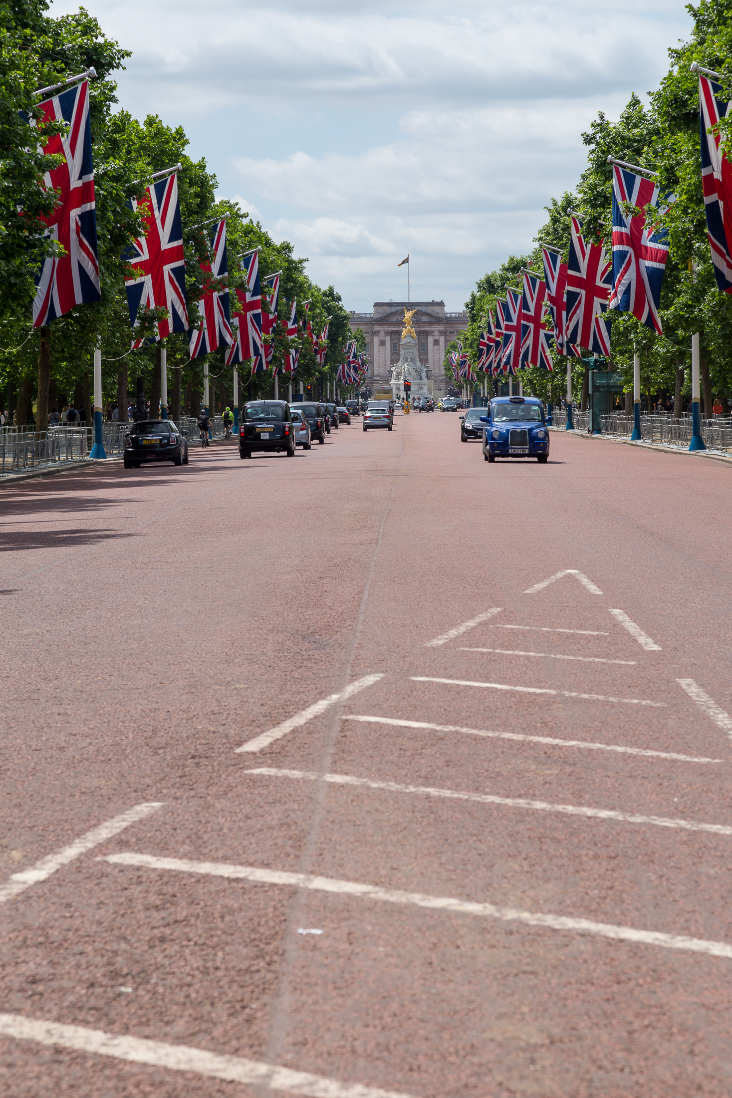 Despite the claustrophobia, I ended up staying a good two hours longer than I had intended. I wandered away from the dispersing crowds for lunch, snapping a picture of London’s iconic taxis while leaving St. James’ Park. I didn’t know it at the time, but all the flags were on prominent display to celebrate the Queen’s “official” birthday the following day. Apparently, I missed even bigger crowds and even warmer weather — and a RAF flyover. A coworker who happened to also visit London that weekend happened just as coincidentally to go to the Changing of the Guard that day and got to experience all three.