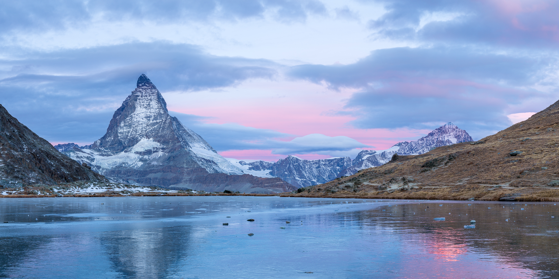 The colors the first morning were almost predictable, to the point that the clear blue sky to the north of the Matterhorn was so uniform that Lightroom thought they were all the same picture, leaving a giant white unstitched gap across the top of the frame. By Sunday, the weather had started to change; winter was coming. It would start snowing Sunday night, and this was actually the very last weekend a snow-free hike up would have been possible. With the clouds came more color — and the surprise of realizing I need yet still to refine my technique.
