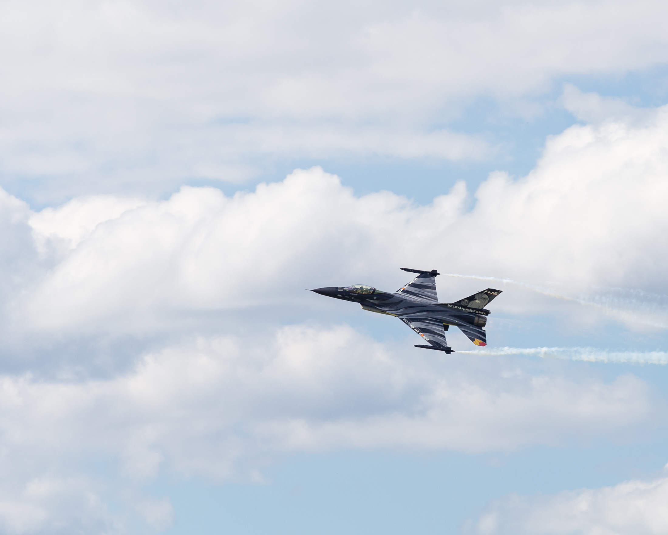 Continued patriotism was the reason for tolerating the relentless afternoon sun. Soon after the P-51D made its appearance, a Belgian F-16 took to the skies. If I thought the twirling maneuvers of the earlier Patrouille Alpha Jets were impressive, seeing the F-16 nearly brought tears to my eyes. Commercial jets are at this point quotidian, but the F-16 has been in a league of its own for combat superiority.