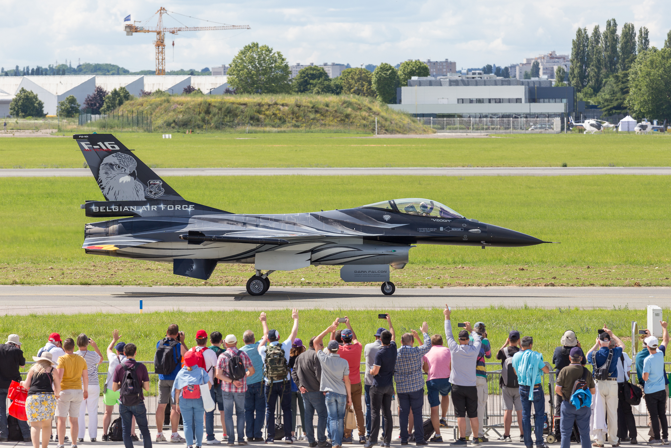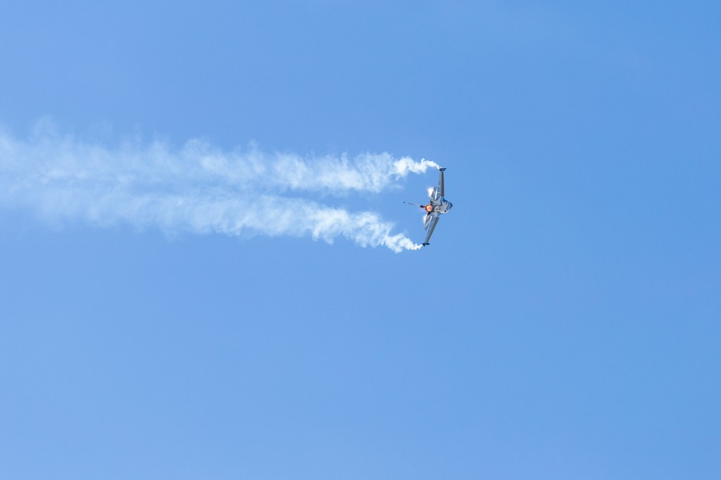 Continued patriotism was the reason for tolerating the relentless afternoon sun. Soon after the P-51D made its appearance, a Belgian F-16 took to the skies. If I thought the twirling maneuvers of the earlier Patrouille Alpha Jets were impressive, seeing the F-16 nearly brought tears to my eyes. Commercial jets are at this point quotidian, but the F-16 has been in a league of its own for combat superiority.