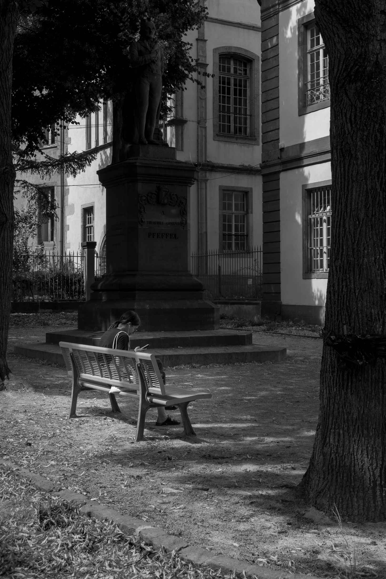 The summer heat kept us out of our top-floor hotel room, and seeking shade we ended up at small park. I remember not being able to get a good composition and lighting on an elderly woman reading her newspaper, but as a juxtaposition there was a young lady reading something on a phone. And so, maybe, the musing of old and new began.