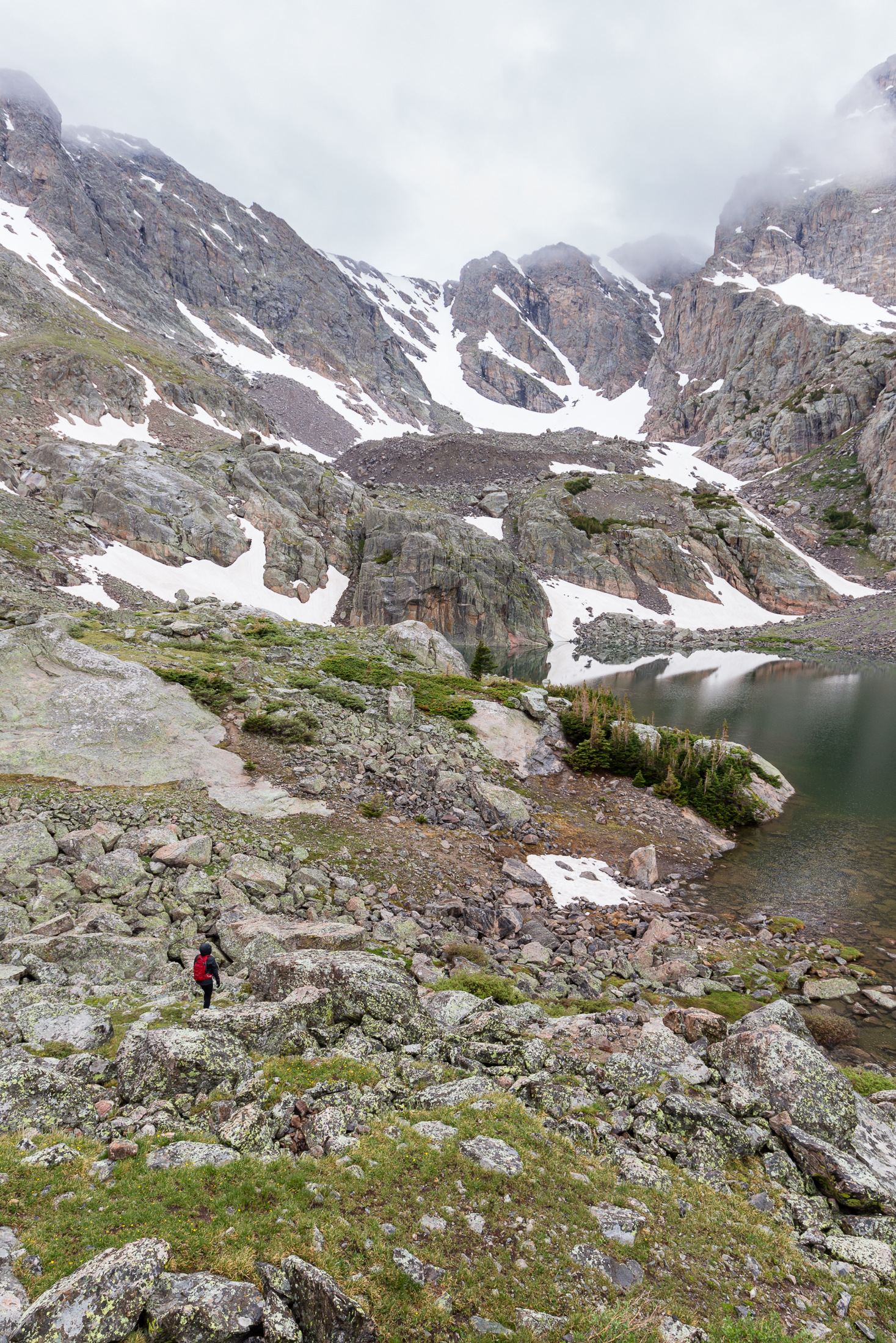 Several noun pairings with “sky” evoke an almost wistful response, and Sky Pond is one. (The Phoenix Sky Harbor International Airport is another.) Unassisted flight is repressed by our awareness of physical limitation, but the freedom and aspiration associated with the idea of flight — the vast heavens above — makes us human. For me, hearing the name “Sky Pond” brings warmth, namely by alluding that there could be some tranquility, joy, or even just a breath away from bustle can be found in some natural earthly environment high in the air. I had most of the lake to myself and skirting toward its south bank I was pretty much alone. While I snacked, a few hikers came and went, and by the time I started back toward the car park, sunny spots on the north bank also started to fill.