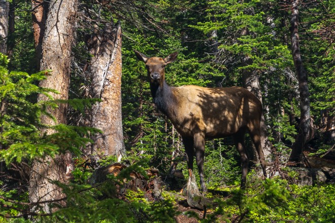 Further down the trail, I stepped off a log bridge and came nearly face-to-face with an elk. We stared at one another before she backed away a few meters into the words and continued foraging. I don’t often spot wildlife on my hikes, so this was something of a treat.