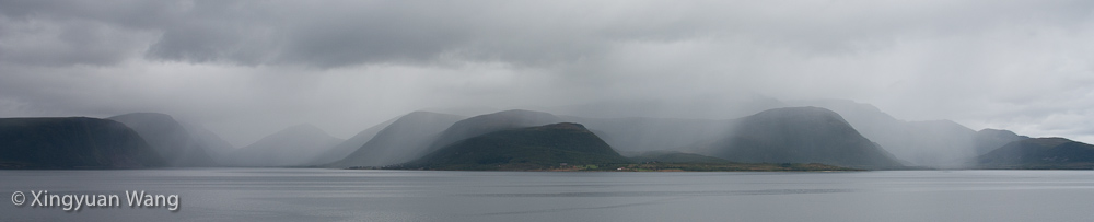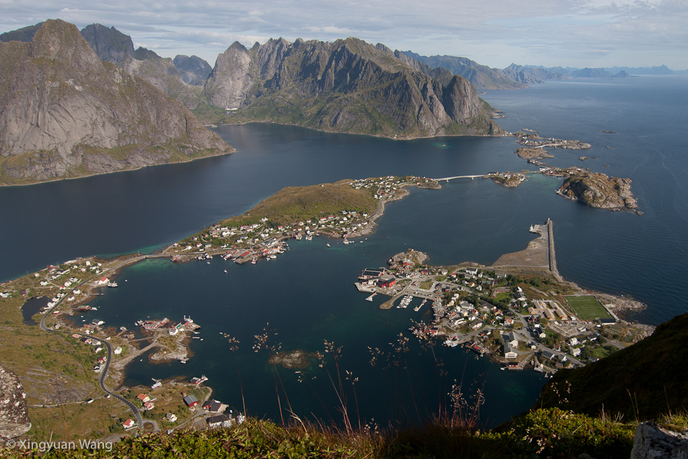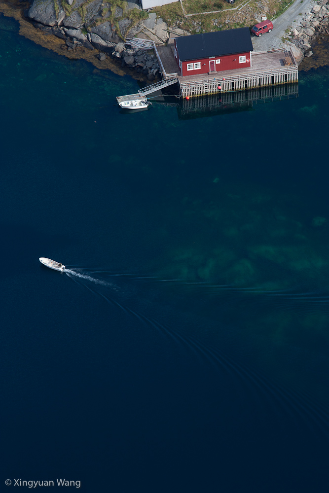 The hike really… wasn’t a “hike.” I was expecting steep and rugged walking, not rugged crawling. There were a few places that I had to scramble up, and in other places I was actually using bush roots to pull myself up steep sections. I even had to tramp through some blueberry bushes, though I admit this was because I had wandered off the trail. Even so, the trail wasn’t quite as I imagined: it wasn’t as strenuous as I though, but the dropoffs were far more exposed than I had made them out to be in my mind. (I later saw a description in another trail description that the hike was only for experienced mountaineers — a bit of an exaggeration, but it was the only warning of its kind I had seen.) Even so, as promised, the view at the top was quite astounding. The mountain looks down at the fishing village of Reine, roughly 400 m straight down. I grabbed a few shots with dirty hands, signed the trail register, and headed back down after about 20 minutes at the ridge at the top. The water, even from this high up, was startlingly clear. I can’t see that the blue waters of Lake Michigan are quite this calming.