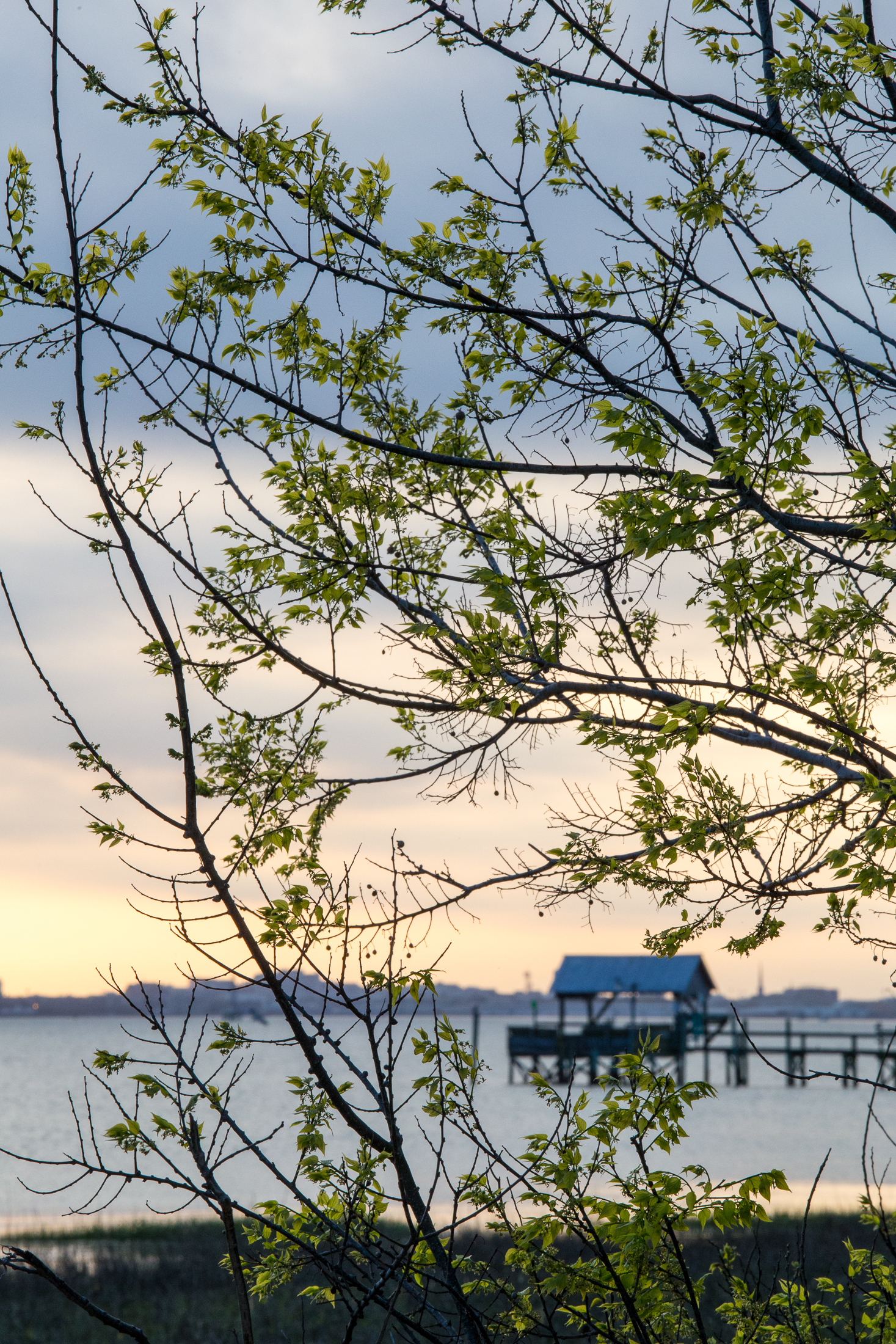 Winter was rather cold in Charleston this year, though sometimes swings in weather bode well for colorful skies at dawn and dusk. I missed a good sunset two weeks ago so headed to Pitt St later that week to make up for it. Clouds extinguished the setting sun quickly, but the trees had started to bud: summer is coming!