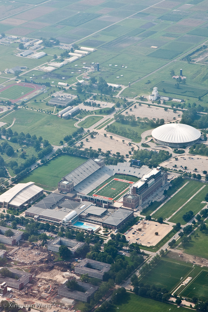 Of great surprise (sarcasm), thirty minutes is a decent amount of time to view the campus from the air, and we began to loop back around. (It was a smooth flight; kudos to Luke Karcher for doing a great job of keeping my mild motion sickness at bay. I even enjoyed the “floatie” he performed for us, even though once was quite enough for me.) Anyhow. Demolition had apparently started on the Six Pack — I hadn’t noticed this when I was on the ground!